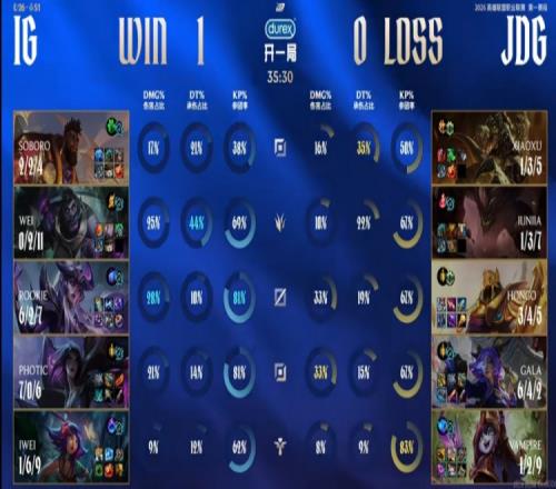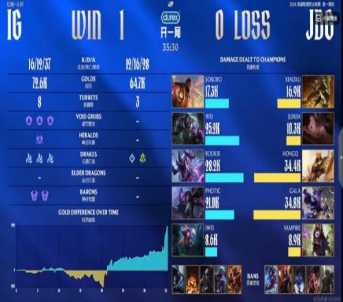 第一局比賽Rookie辛德拉對位壓制HongQ沙皇,兩邊的AD在前期都成功團戰(zhàn)拿下?lián)魵ⅲ≈衅贏L借助運營幫助HongQ沙皇補充經(jīng)濟,GALA蕓阿娜也是連續(xù)拼命輸出頂住了局勢!但是iG依靠Jwei妮蔻連續(xù)完美開團掌握局勢,小龍給到了JDG壓力!決勝大龍團Rookie辛德拉搶大龍成功+隨后金身+閃現(xiàn)拉扯到了Xiaoxu鱷魚,他輸出拉滿配合Photic卡莎完成殘局的收割!iG團滅JDG先拿一分!