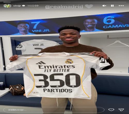 維尼修斯達成為皇馬出戰350場比賽里程碑,賽后他在社交媒體上曬出與紀念球衣的合照。