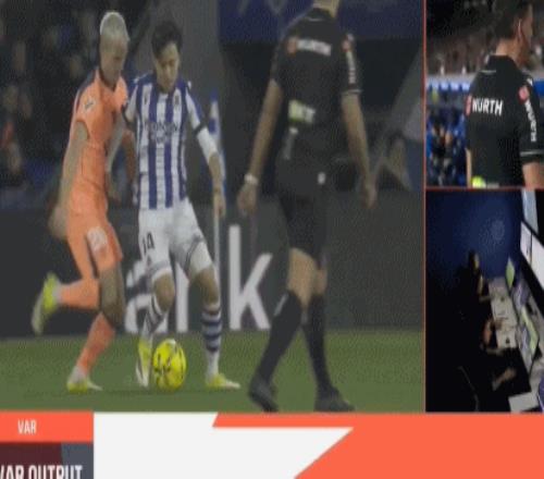 裁判回看VAR后認(rèn)定奧爾莫確實(shí)對久保建英犯規(guī)在先,因此進(jìn)球被判無效。