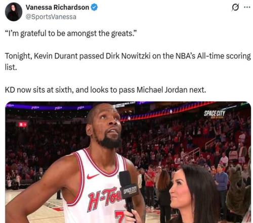 面對這一含金量十足的里程碑,賽后杜蘭特說道:“意義重大,德克一直是我仰望的人,也是我曾經對抗過的對手,我一直向他學習,能在主場達成這項成就的感覺太棒了,感謝到場的球迷,也感謝身旁的隊友,我們會延續這股勢頭繼續前進。”