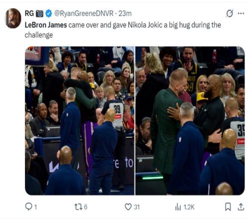 比賽結(jié)束后約基奇與詹姆斯也緊緊相擁,約基奇祝賀老詹拿到勝利,老詹祝賀約基奇入選全明星先發(fā),超巨都是惺惺相惜。