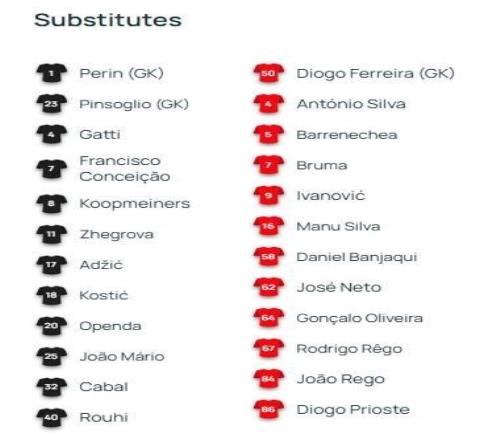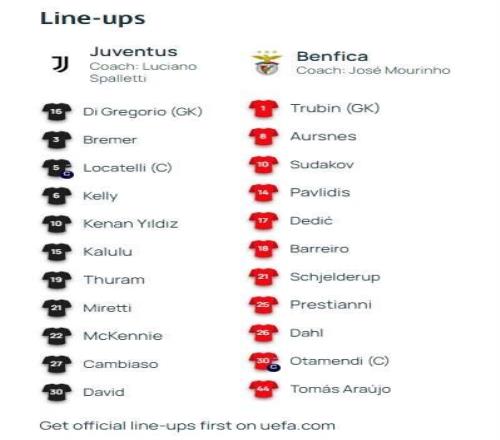 北京時(shí)間1月22日04:00,歐冠 聯(lián)賽階段 第7輪,尤文圖斯主場(chǎng)迎戰(zhàn)本菲卡,賽前雙方球隊(duì)首發(fā)名單公布如下:
