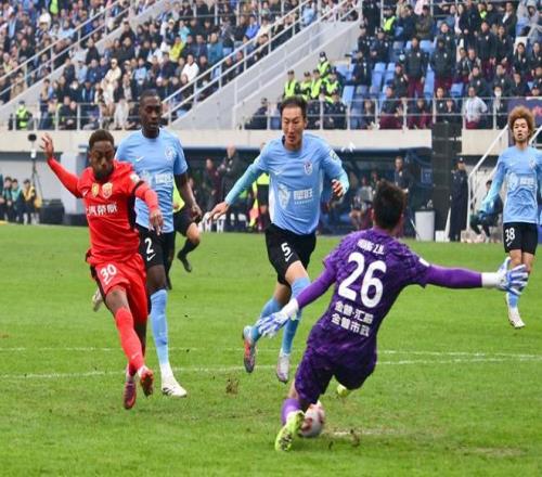 2025年11月22日,上海海港隊球員加布里埃爾(左一)在比賽中射門得分。 當(dāng)日,在遼寧大連舉行的2025賽季中國足球協(xié)會超級聯(lián)賽第30輪比賽中,上海海港隊客場1比0戰(zhàn)勝大連英博海發(fā)隊,獲得本賽季中超聯(lián)賽冠軍。 新華社發(fā)