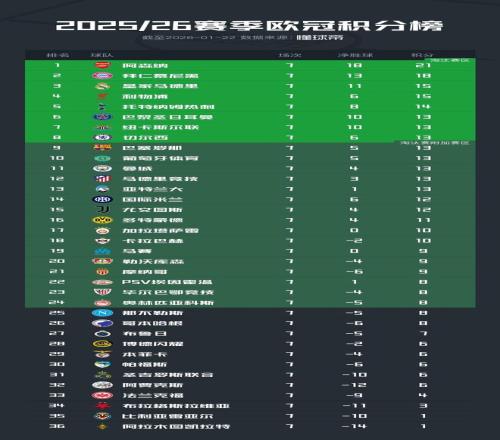北京時間1月22日,2025/26賽季歐冠聯(lián)賽階段第7輪的比賽全部結(jié)束,積分榜的形勢也產(chǎn)生了進一步的變化。