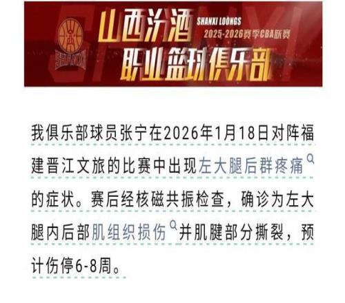 更令人悲傷的是,在與福建隊的比賽中,張寧受傷了。根據山西男籃自己官宣的消息,張寧被確診為左大腿內后部肌組織損傷并肌腱部分撕裂,預計傷停6-8周。如此一來,張寧將會無緣新一期中國男籃集訓隊了,讓郭士強失去一大選擇,真是太遺憾了。