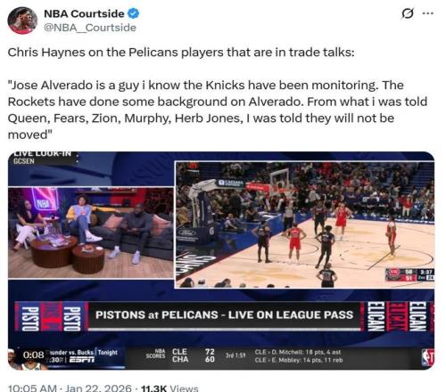 尼克斯隊記Ian Begley也曾曝出球隊一直都在等待鵜鶘隊將阿爾瓦拉多正式擺上貨架。