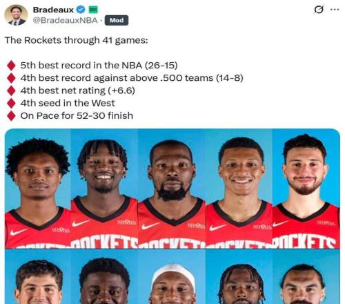 好在開局表現(xiàn)強勢,加上1月中旬勢頭隨著小賈找回三分手感,以及謝潑德的爆發(fā)戰(zhàn)績有所回暖,才讓火箭隊在半程之際重返西部第四位置。
