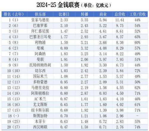 1月21日,德勤會計師事務所發布2024-25賽季金錢聯賽報告,收錄了上賽季世界足壇營收金額前20名俱樂部(以下簡稱“二十強”)的財政數據。