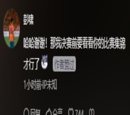 彭嘯在社媒回應(yīng)稱:哈哈謝謝!那我決賽前要看看你的比賽集錦才行了。???
