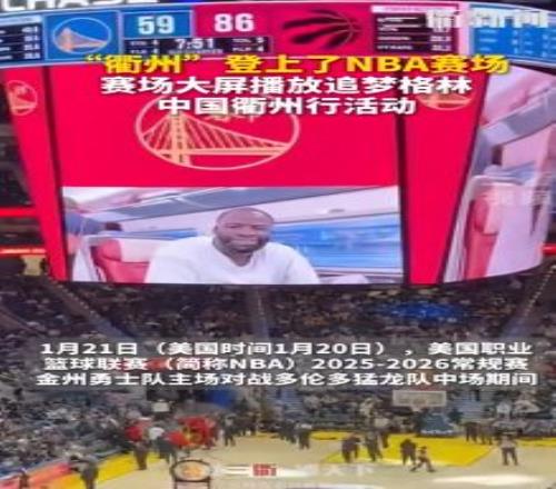 1月21日(美國時間1月20日),美國職業籃球聯賽(簡稱NBA)2025-2026常規賽,金州勇士隊主場對戰多倫多猛龍隊中場期間,賽場大屏播放NBA四冠王追夢格林中國衢州行活動,向廣大中國球迷致以新年問候。