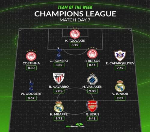 WhoScored歐冠本輪最佳陣容:姆巴佩、維尼修斯、熱蘇斯在列