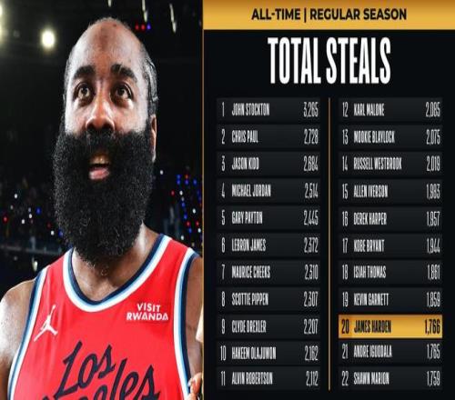 需要關注的是,當對手在末節轟出19比7的攻勢將分差縮小至2分之際,哈登命中了遠投幫助快船穩住了局面。值得一提的是,哈登還在此役創下了紀錄。此役之后,哈登已經拿到生涯第1766個搶斷。哈登生涯搶斷數正式超越伊戈達拉,升至NBA歷史搶斷榜第20位,下一個追逐名宿凱文加內特(1859)。