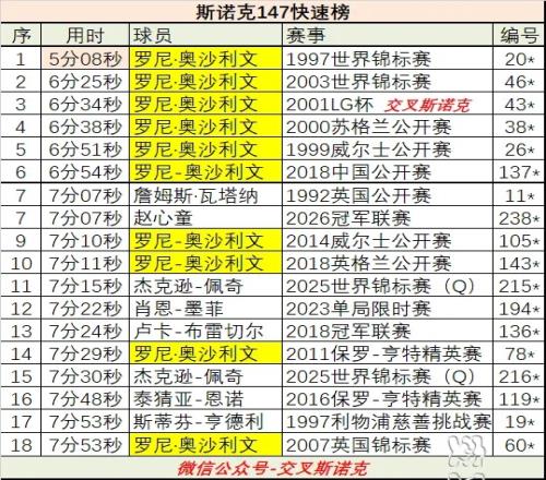 據博主“交叉斯諾克”統計,這桿147僅用時7分零7秒,和瓦塔納并列亞洲最快,在整個斯諾克歷史上排名并列第七,前六均為奧沙利文創造。