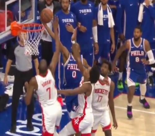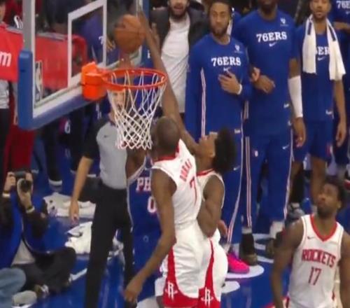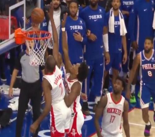 比賽末節最后時刻,雙方115-115戰平,76人后衛馬克西持球突破沖進內線完成上籃,在籃球觸碰到籃板后,火箭前鋒杜蘭特再次觸碰籃球,按照規則應該是干擾球違例,但裁判并未吹罰。