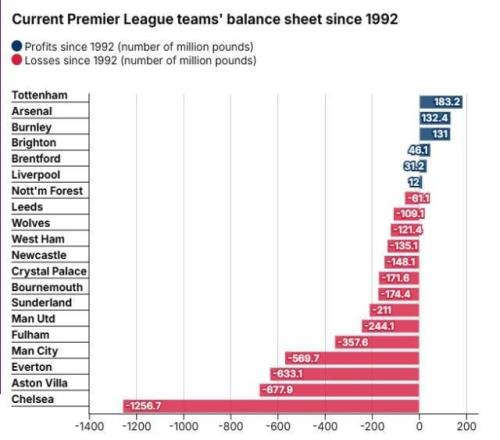 英超時代盈虧榜:熱刺、阿森納盈利前二,切爾西虧損超12億鎊墊底
