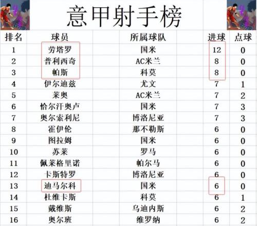 射手榜方面,勞塔羅今天又打入一球,12球繼續領跑,比第2的普利西奇,帕斯多了4球。迪馬爾科今天1射2傳造3球,追上圖拉姆,蘇萊,霍伊倫等人6球剛好擠入前十。