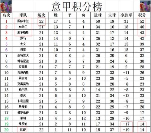積分榜方面,國米逆轉大勝比薩之后,先賽的他們領先第2的AC米蘭6分,多第3的那不勒斯9分,繼續坐穩榜首位置。比薩遭逆轉慘敗后,凈勝球劣勢,換掉維羅納,成了新的副班長。
