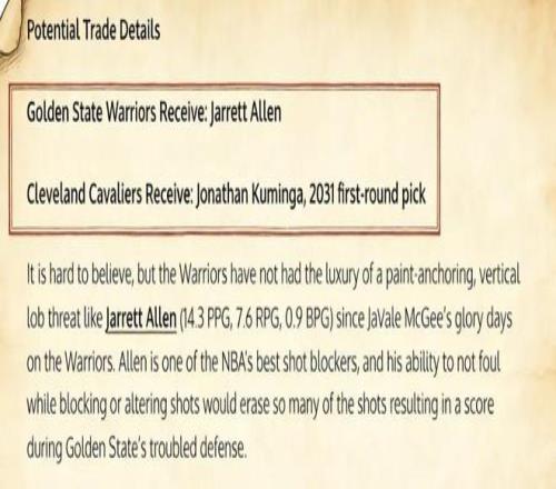 美媒《Fadeaway World》撰文建議,勇士可以將庫明加和2031年的首輪簽打包送到克利夫蘭,換回中鋒阿倫。