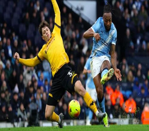 開(kāi)場(chǎng)之后,曼城就大舉壓上,開(kāi)啟了傳控的壓迫性打法,狼隊(duì)防守有些顧此失彼。第6分鐘,努內(nèi)斯邊路沒(méi)有任何調(diào)整,直接傳球,狼隊(duì)中衛(wèi)準(zhǔn)備頭球解圍,被馬爾穆什搶先一腳,將球打進(jìn)。