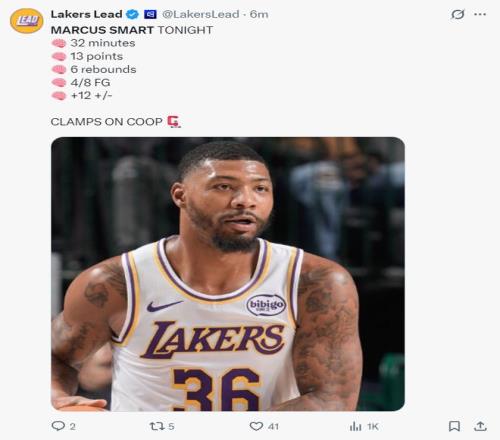 隨后在詹姆斯上籃偏出時(shí)斯瑪特從天而降完成補(bǔ)籃,這一球后湖人再度領(lǐng)先到3分,末節(jié)斯瑪特拿到7分4籃板1助攻1蓋帽(5中2+罰球5中3)。
