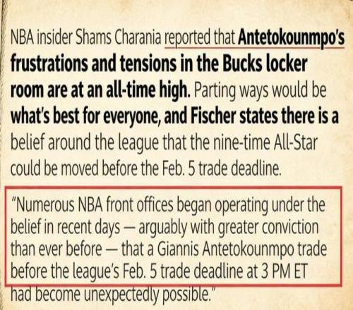 “雄鹿內部和更衣室的緊張氛圍已經達到頂點,聯盟很多球隊的管理層都相信,或者說比任何時候都相信,在東部時間2月5日下午3點聯盟交易截止日期之前,交易可能會達成。”Shams如是說道。
