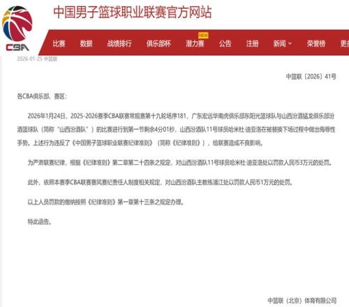 根據(jù)CBA聯(lián)賽的相關(guān)規(guī)則,對迪亞洛進行罰款30000元的處罰。同時,山西隊主教練潘江作為球隊的賽風賽紀責任人,進行罰款10000元的處罰。