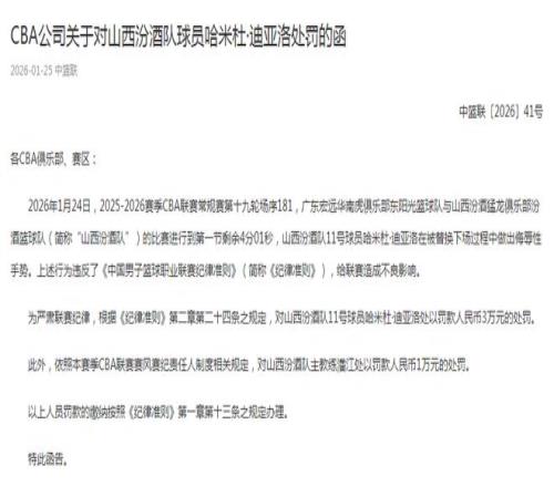 2026年1月24日,2025-2026賽季CBA聯(lián)賽常規(guī)賽第十九輪場序181,廣東與山西的比賽進(jìn)行到第一節(jié)剩余4分01秒,山西11號球員迪亞洛在被替換下場過程中做出侮辱性手勢。上述行為違反《中國男子籃球職業(yè)聯(lián)賽紀(jì)律準(zhǔn)則》,給聯(lián)賽造成不良影響。
