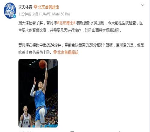 只是賽后曾凡博再度出現傷病反復情況,如今根據《天天體育》最新報道顯示:“據天體記者了解,曾凡博在北京德比賽后腰部水腫加劇,今天前往醫院檢查,醫生要求他暫停比賽,并需要幾天進行治療,對陣山西男籃將大概率缺陣。”