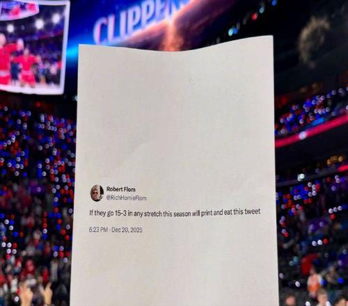 而一天后,也就是12月21日就有評論員發文稱:如果快船隊在接下來的任何一段賽程中,取得了15勝3負的成績,他就會將自己說過的這番話打印出來,并且吃掉。值得一提的是,今天快船隊球迷就把這個動態打印出來,帶到了現場。而隨著今天快船隊126-89大勝籃網隊,快船隊自12月20日以來的18場比賽,戰績來到了15勝3負,愈發接近泰倫·盧的35勝20負了。