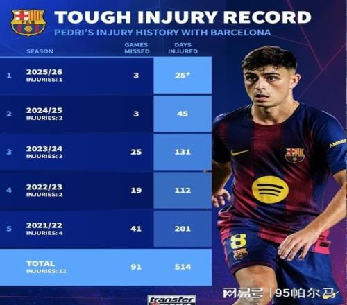 從另一個角度說,佩德里還沒徹底重視自己的傷病史。自2021-22賽季以來,佩德里先后受傷13次,因傷缺陣了579天,缺席了球隊的104場比賽,這是一組觸目驚心的數字。