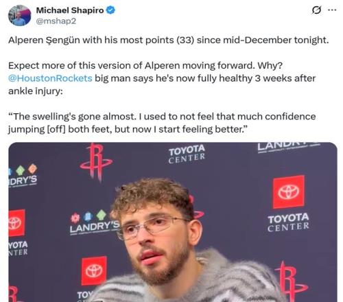 賽后火箭媒體人Chris A. White點出申京狀態(tài)回暖的核心原因:“現(xiàn)在終于可以說申京的腳踝已經(jīng)完全恢復(fù)健康?!?/p>