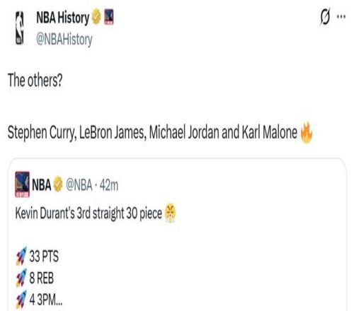 這也讓杜蘭特成為歷史第5位在37歲后還能連續(xù)3場30+的球員,成功比肩喬丹、詹姆斯、庫里和卡爾-馬龍。