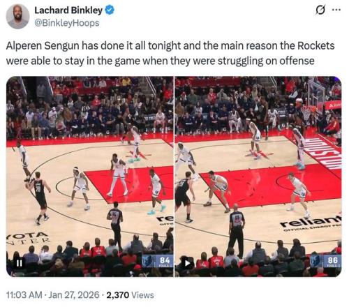 面對申京這樣的表現(xiàn),火箭記者Lachard Binkley連發(fā)數(shù)條推特稱贊申京。