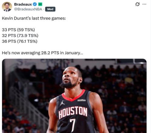 這也是杜蘭特火爆狀態(tài)的縮影,過去3場比賽杜蘭特場均苦戰(zhàn)40.6分鐘,連續(xù)三場交出30+得分表現(xiàn),場均能夠轟下33.7分7.3板2.7助,三項命中率54.7/50.0/81%,一月份至今場均拿下28.2分。