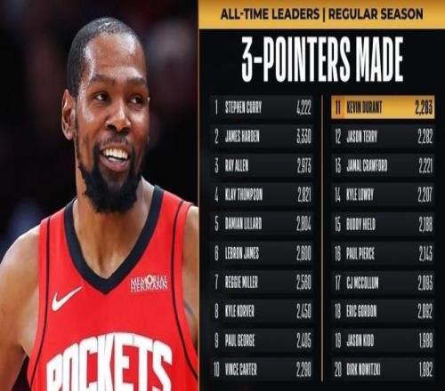 全場杜蘭特24中11,三分9中4,拿下33分8板2助1蓋帽,憑借這樣的表現(xiàn),杜蘭特生涯三分命中總數(shù)提升至2290個,成功追平卡特并列NBA歷史第十。