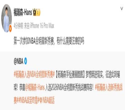 北京時間1月27日,NBA官方曬出了楊瀚森的手繪漫畫形象,并配文寫道:“夢想照進現實,征途此刻璀璨!恭喜楊瀚森入選2026NBA全明星新秀挑戰賽陣容。”楊瀚森本人轉發了這條社媒,并回應道:“第一次參加NBA全明星新秀賽,有什么需要注意的嗎?”
