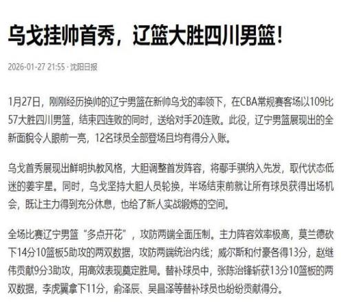 換帥之外,遼寧隊就取得大勝也讓許多球迷感到欣慰。