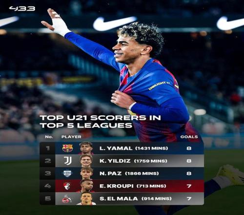 本賽季五大聯賽U21球員進球榜:亞馬爾、伊爾迪茲、帕斯8球第1