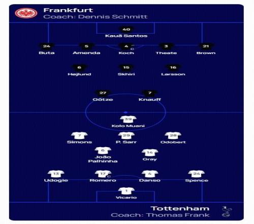 法蘭克福首發:40-考阿-桑托斯、5-阿門達、4-科赫、3-阿蒂爾-蒂特、24-布塔、6-奧斯卡-霍伊倫、16-胡戈-拉松、21-納撒尼爾-布朗、15-斯希里、27-格策、7-克瑙夫