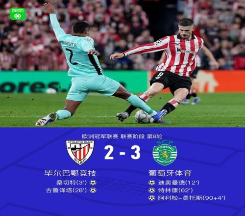 北京時(shí)間1月29日歐洲冠軍聯(lián)賽 聯(lián)賽階段 第8輪,畢爾巴鄂競(jìng)技對(duì)陣葡萄牙體育。畢爾巴鄂競(jìng)技桑切特破門,古魯澤塔破門。葡萄牙體育迪奧曼德破門,特林康破門,阿利松-桑托斯破門。最終比分畢爾巴鄂競(jìng)技 2-3 葡萄牙體育。