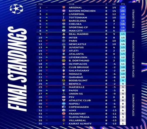 隨著第八輪戰罷,歐冠全新的聯賽階段排名塵埃落定,出現了多起令人意外的結局。