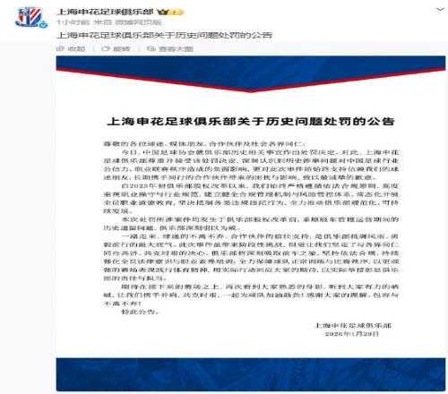 1月29日上午,國家體育總局、公安部、中國足協(xié)聯(lián)合召開新聞發(fā)布會,介紹足球行業(yè)“假賭黑”問題專項整治行動的相關情況,13家俱樂部被罰。其中,上海申花足球俱樂部,扣10分并罰款100萬元;上海海港足球俱樂部,扣5分并罰款40萬元。當天,上海兩家足球俱樂部發(fā)文致歉。