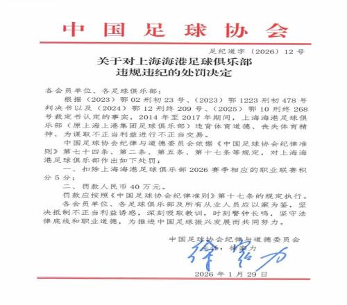 北京時間1月29日,中國足協通報有關涉案俱樂部及人員行業處罰情況,9家中超俱樂部被不同程度地扣除新賽季聯賽積分。分別被扣10分和5分的上海申花和上海海港先后發聲,表示接受處罰決定。