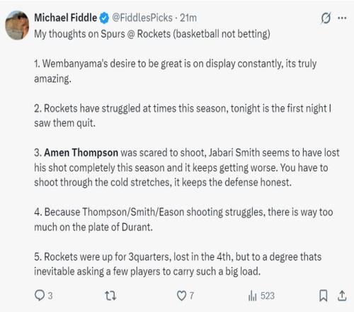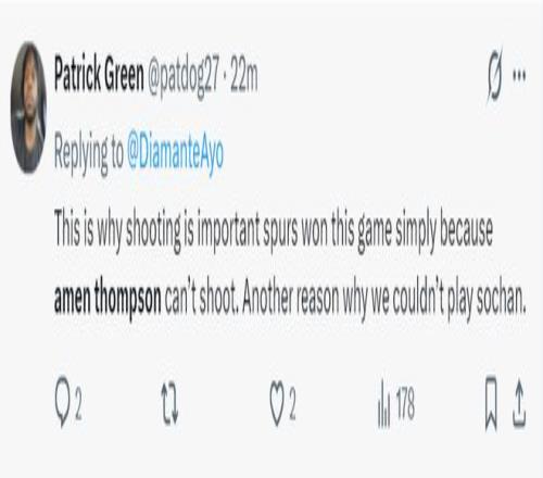 刺蜜:這就是為什么投籃能力如此重要,因為阿門無法投籃所以馬刺贏得了比賽,此外我們不讓不會投籃的索漢登場也是贏球原因之一。