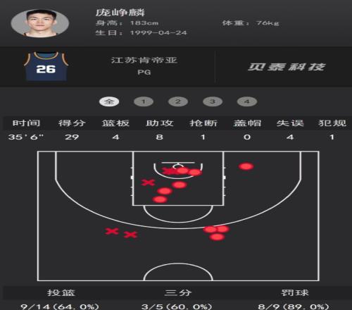 此役龐崢麟35分鐘,14中9,三分5中3,罰球9中8,拿到29分8助攻4籃板1搶斷,命中率64%,三分命中率60%,罰球命中率89%,正負(fù)值+28。