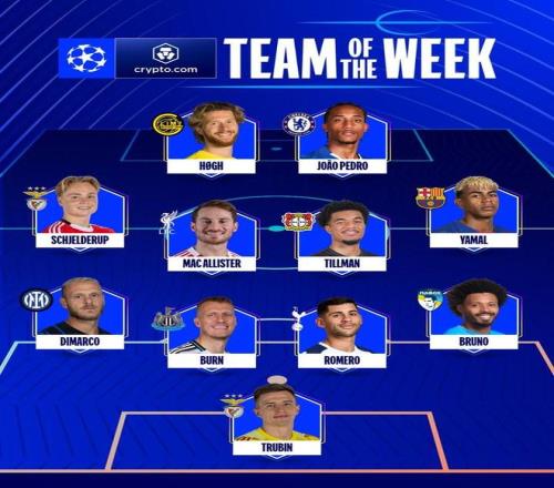 歐冠官方公布了聯(lián)賽階段第8輪的最佳陣容,戰(zhàn)皇馬破門的本菲卡門將特魯賓入選,亞馬爾在列。