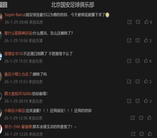 結果出來后,原先北京國安也象征性硬剛一下,不久又刪文。此舉引起北京國安球迷的不滿,大家又在最近的動態下留言(下圖)。有球迷非常失望地寫道:“國安球迷最引以為傲的信仰,今天被徹底被撕下來了[淚]”,還有球迷感嘆原本冰清玉潔的形象毀了。更有球迷要求“出來道歉!還我國安,還我信仰”。