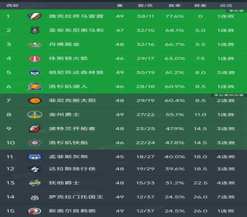 北京時(shí)間1月30日,今日的NBA常規(guī)賽結(jié)束了所有比賽,我們看看西部最新積分榜變動!雷霆111-123不敵森林狼,掘金107-103險(xiǎn)勝籃網(wǎng),太陽114-96戰(zhàn)勝活塞,獨(dú)行俠121-123憾負(fù)黃蜂,火箭104-86戰(zhàn)勝老鷹,國王111-113惜敗76人!