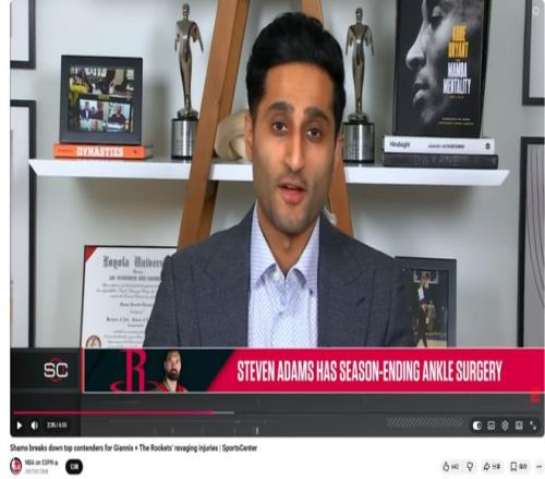 消息來自于ESPN權威名記Shams,他在節目中談及亞當斯賽季報銷后火箭隊在交易截止日前的計劃與想法。