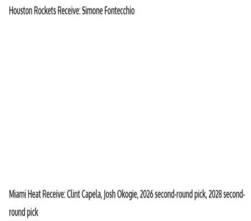 熱火得到:卡佩拉+奧科吉+26年二輪簽+28年二輪簽。